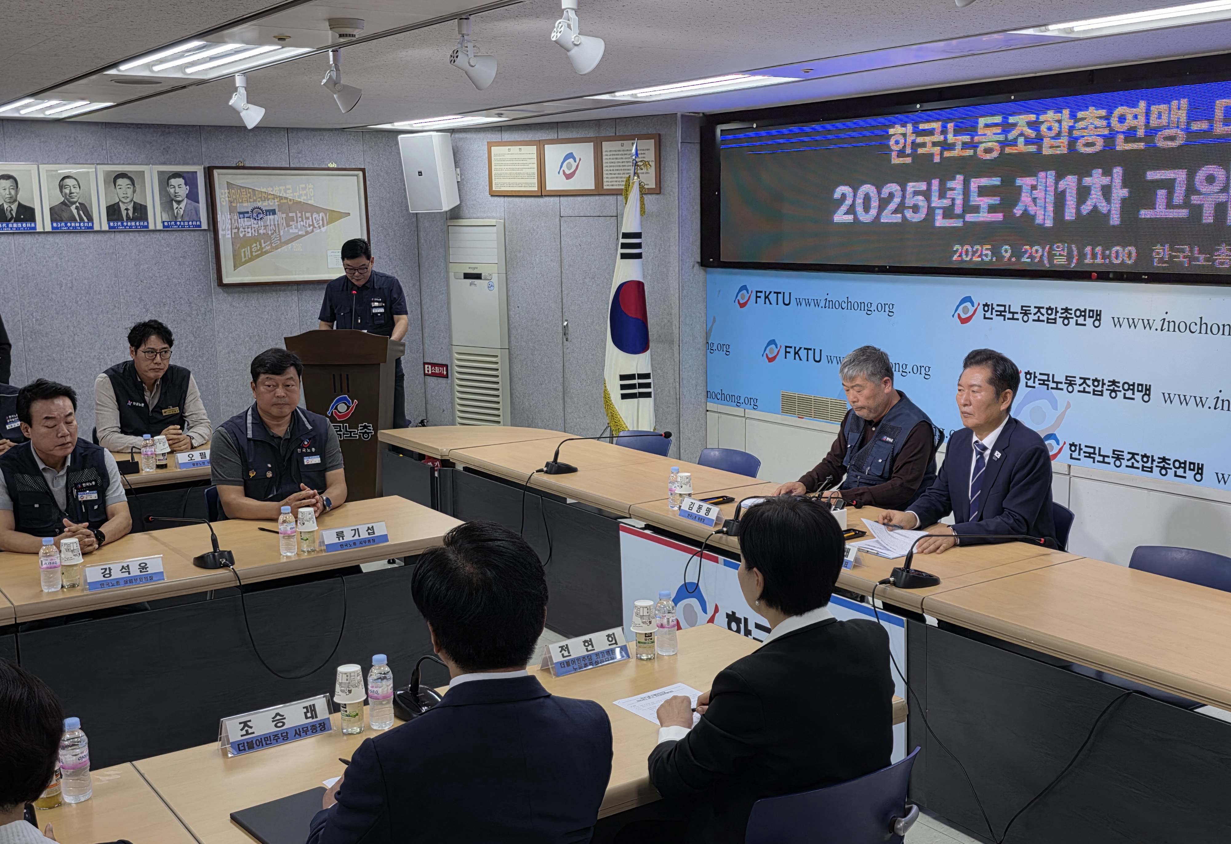 한국노총과 더불어민주당은 9월 29일 11시, 한국노총 대회의실에서 「2025년 제1차 고위급 정책협의회」를 개최하였습니다. 이번 회의에는 정청래 더불어민주당 대표와 전현희 최고위원을 비롯해 국회의원과 당 관계자 등 10여 명이 참석했으며, 노동계에서는 김동명 한국노총 위원장을 중심으로 교육연맹을 비롯한 산별연맹 대표자 20여 명이 함께하였습니다.